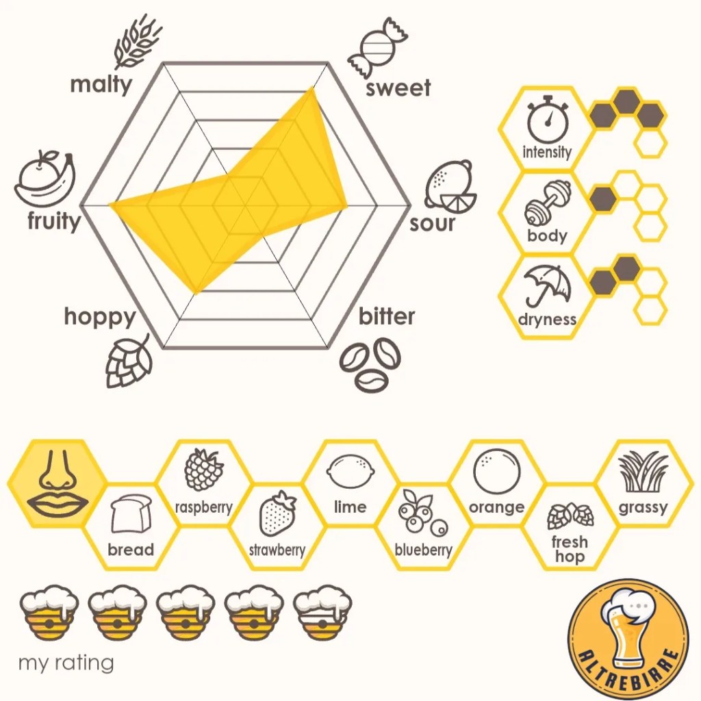 🍻 🇮🇹 – Versa un dorato intenso, con texture velata, carbonatazione eccitante e residui in sospensione. La schiuma è sottile, biancastra, con piccole bollicine e ritenzione favolosa. Al naso, gli aromi sono una spettacolare combinazione di frutti di bosco e onde floreali e agrumate date dalla luppolatura. Arriva poi anche una punta di latte e pane. Il primo sorso è un tornado di gusti con la dolcezza delle bacche in testa, seguita immediatamente dalle sfumature erbacee del luppolo. Il corpo è abbastanza esile, frizzante e con un retrogusto che ti ricorda che stai bevendo una DDH dove, a un certo punto, arrivano anche spintarelle di limone e banana. Non così complessa, alla fine, considerando tutti gli esteri. Birra fantastica.