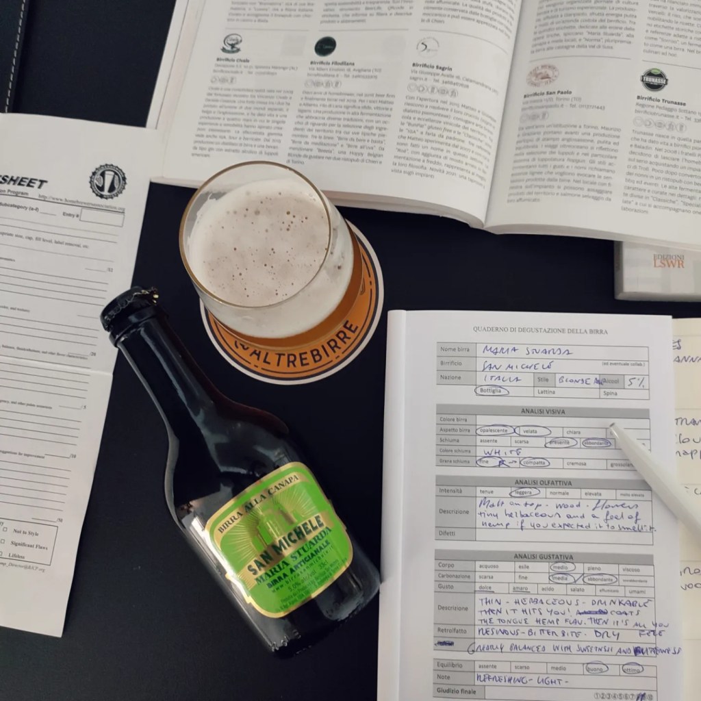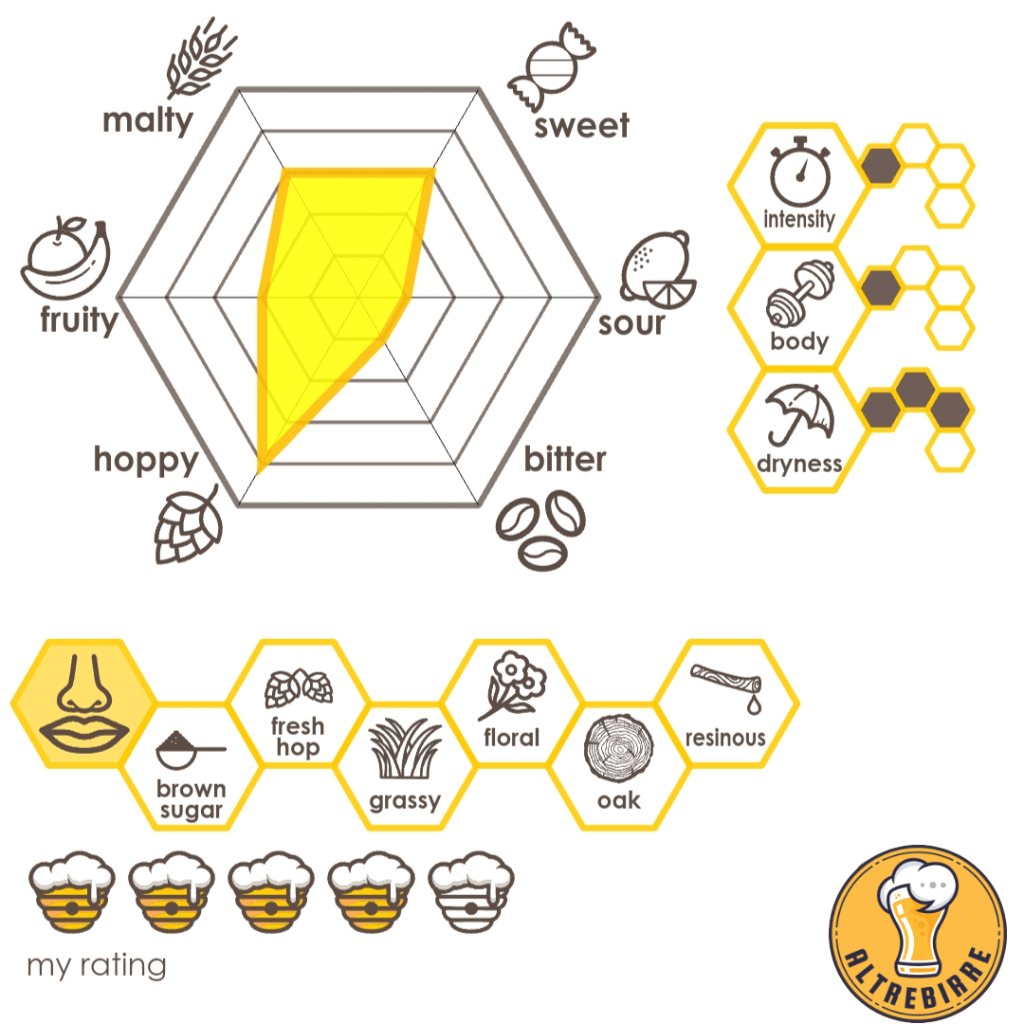 🍻 🇮🇹 Versa un paglierino dorato con texture nebbiosa e vivace. La schiuma è bianca a grana fine con buona ritenzione. Al naso, il malto arriva prima con un’onda dolce e grezza, legnosa e floreale, seguita da una sfumatura erbacea. Il primo sorso è facile, pieno e divertente. La canapa è dominante e abbraccia la lingua e la gola, mischiandosi con un finale sorprendentemente asciutto e luppolato. Canapa e luppoli persistono del retrogusto, su uno sfondo resinoso. Il corpo è abbastanza esile con buona carbonatazione. Una birra rinfrescante e bilanciata.