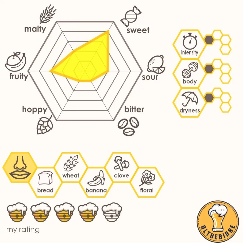 🍻 🇮🇹 Versa un paglierino chiaro con texture velata e vivace. La schiuma è bianca, compatta e dall’ottima ritenzione. Al naso, banana e un eco di agrumi, decisi ma piacevoli con un velo di lievito e fiori. Il primo sorso è affilato per l’alta carbonatazione con la banana e il frumento che si prendono la scena, seguiti da una gentile onda di chiodi di garofano, in pure stile Hefeweizen. Lo sfondo speziato persiste durante la bevuta accompagnato da sfumature erbacee e di pane. Il corpo è tondo e relativamente cremoso. Il finale è secco con deboli eco di luppolo. Bilanciata, semplice e soddisfacente.