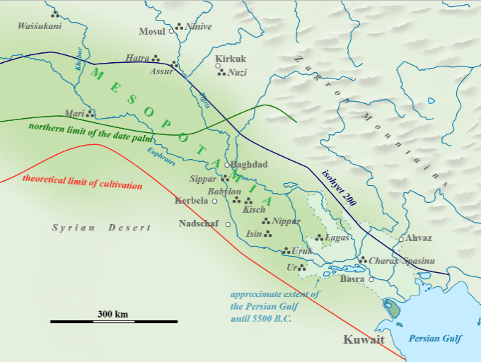 La Mesopotamia, una delle prime regioni a essere abitate dall’umanità, si estendeva tra i fiumi Tigri ed Eufrate e costituiva una delle aree più fertili del Vicino Oriente antico. Questa vasta pianura alluvionale copriva un’area approssimativa di 350.000 chilometri quadrati, corrispondente all’attuale Iraq meridionale e parte dell’Iran sud-occidentale. La geografia e l’ambiente della Mesopotamia hanno avuto un impatto profondo sulla nascita e sulla crescita delle prime civiltà umane in questa regione.