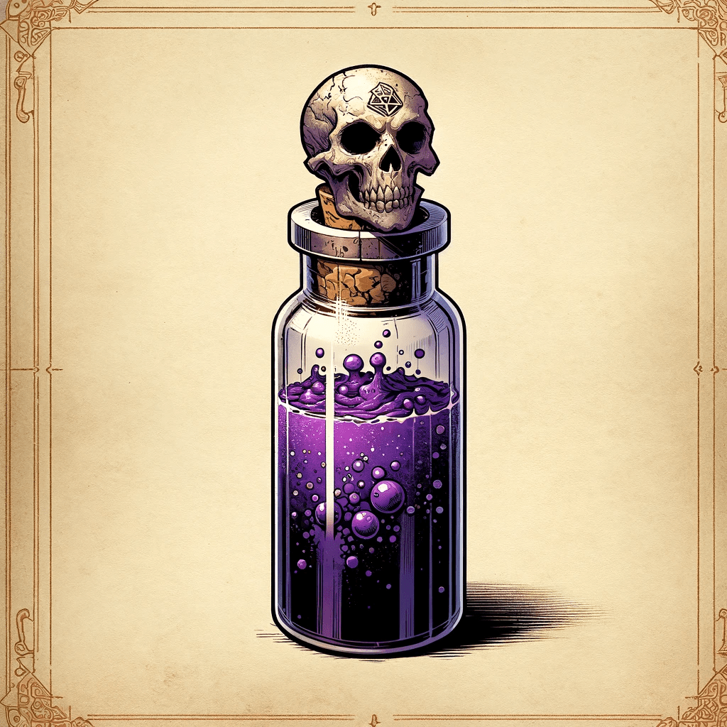 La Fiala del Necromante è un oggetto alchemico tanto inquietante quanto affascinante. La sua caratteristica più distintiva è il tappo di pietra bianca a forma di teschio finemente scolpito e incastrato in un comune tappo di sughero. La fiala stessa è fatta di vetro trasparente; un liquido denso di colore viola scuro, con sfumature nere, respira lentamente all’interno, come se fosse dotato di una propria volontà.