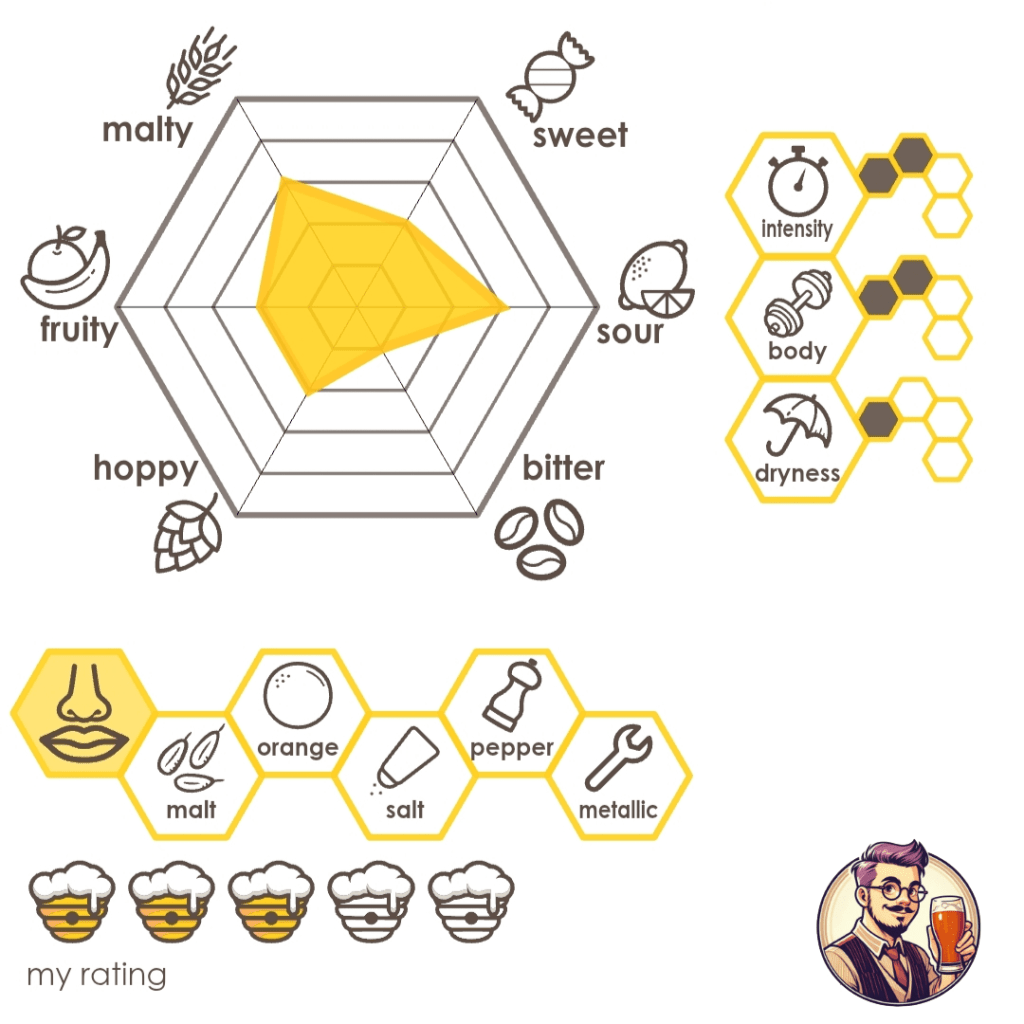 Dorata velata, con schiuma fine e fugace che scompare come una parola dimenticata. Al naso emergono accenni fenolici, olive leggere, echi lievitati e fiori timidi. In bocca irrompe secca, decisa, tagliente. C’è ferro, sale, pepe, un amaro tenace che non cerca equilibrio. Un profilo spigoloso, scontroso, eppure tenace come una voce che insiste.