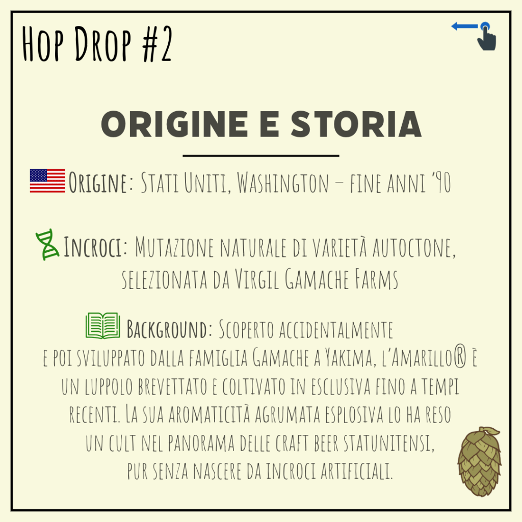 Amarillo® è un luppolo brevettato sviluppato alla fine degli anni ’90 da Virgil Gamache Farms, a Yakima (Washington), a partire da una mutazione naturale. Inizialmente disponibile solo attraverso il produttore, ha poi conosciuto un’esplosione di popolarità grazie al suo profilo agrumato esuberante, immediatamente riconoscibile.