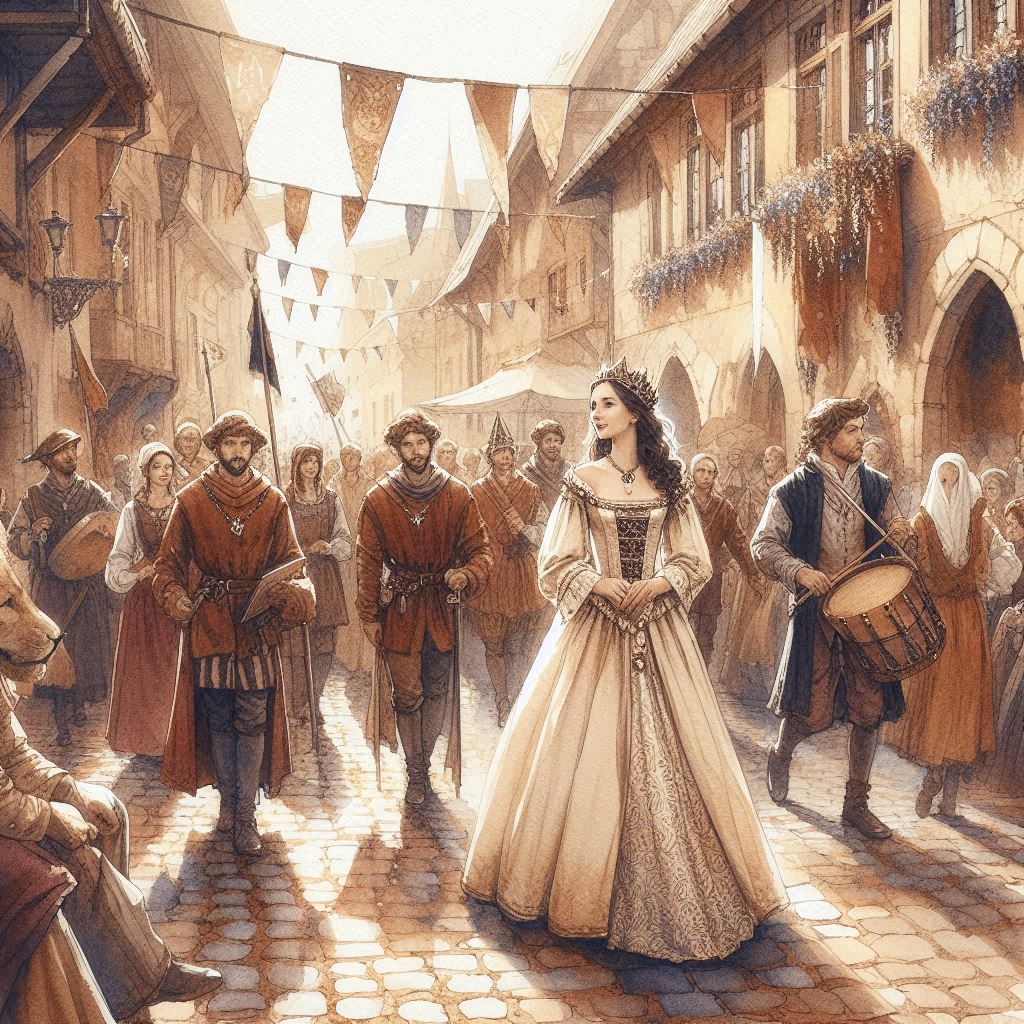 Le prime note squillarono in aria come un richiamo antico, e in un attimo la folla si fece più silenziosa, attenta. La banda del paese, vestita con casacche color cremisi e blu notte, avanzava in formazione, guidata da un tamburino dall’aria fiera e un pifferaio il cui strumento curvo sembrava uscito da un manoscritto miniato.