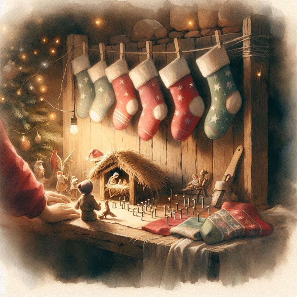Il bordo del presepe era il posto perfetto per piantare due o tre chiodi e appendere qualche calza. Ne avevo di tanti tipi, misure e colori. Ogni anno, ricevendone alcune in regalo, le conservavo per riutilizzarle poi l’anno successivo. Certo, da un anno all’altro non ricordavo più quali avessi, per cui mi ritrovavo a spulciarle tutte per scegliere quella che, per qualche settimana, sarebbe stata la prescelta. Papà preparava i chiodini, e io sceglievo le calze per tutti. Il clima di attesa mi ricordava che prima o poi qualcuno sarebbe passato a riempirle..