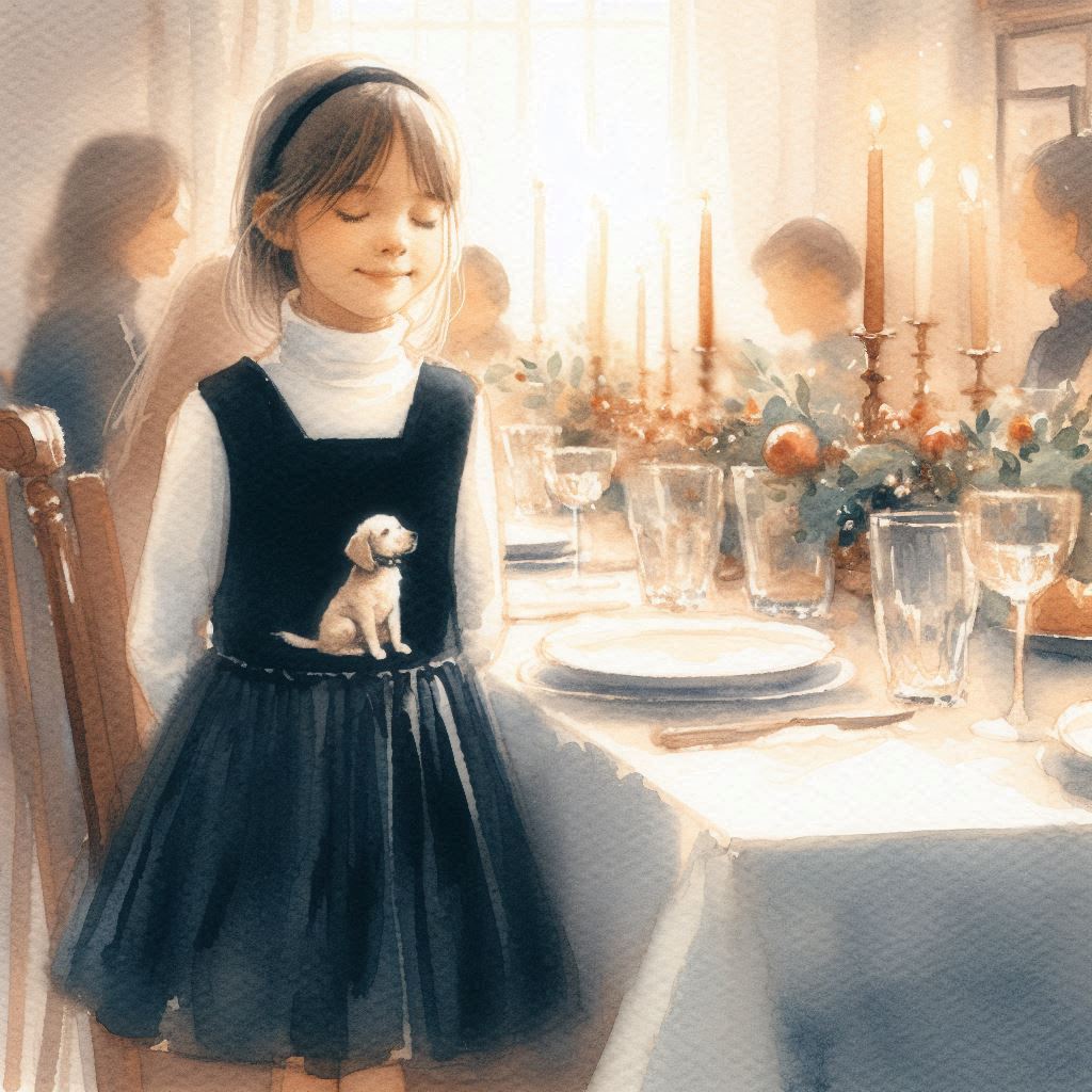Ricordo di un Natale trascorso a casa nostra in cui indossavo uno dei miei vestiti invernali preferiti. Avrò avuto circa 7 anni e avevo un abito smanicato di colore nero con disegnato davanti un piccolo cagnolino. Sotto, una maglia dolcevita bianca. In testa, il solito cerchietto di sempre, che per diversi anni è stato un compagno inseparabile delle mie giornate (e delle mie acconciature).
