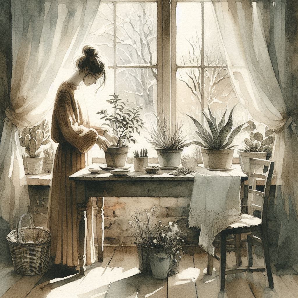 La prima occupazione fu il rinvaso di alcune piante. Ne possedeva poche, ma ciascuna reclamava ormai uno spazio più ampio in cui crescere. Aveva acquistato un vaso nuovo, ampio, destinato alla più alta e sofferente. Con pazienza trasferì poi le altre, una dopo l’altra, nei vasi che man mano liberava.