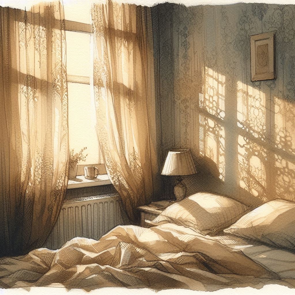 La tenda copriva soltanto una sottile porzione della finestra, lasciando intravedere il panorama esterno tra i ghirigori ricamati nel tessuto. Accoglieva con delicatezza la luce dell’alba che si posava prima sulla parete, poi sul bordo del letto, e, infine, sul davanzale.