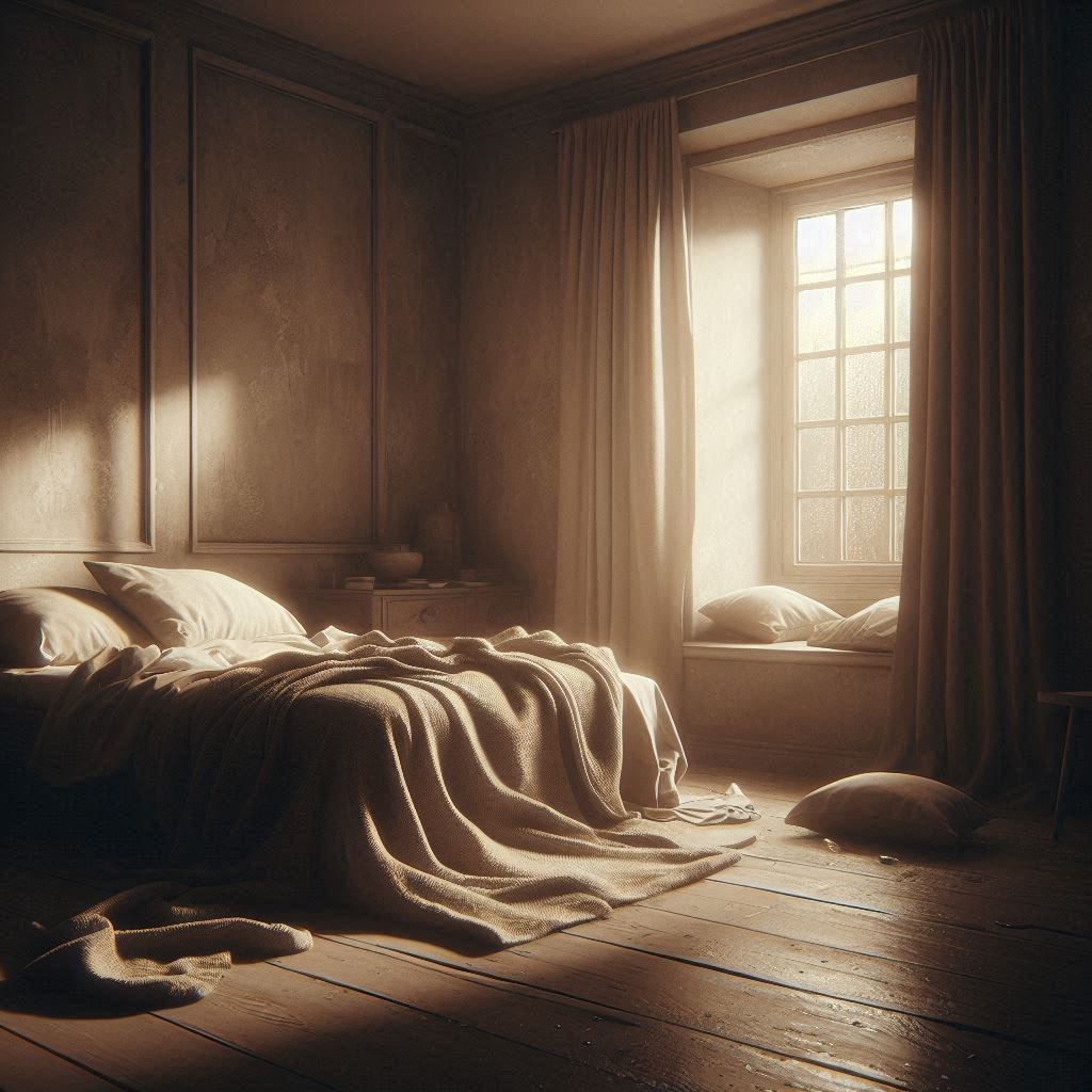 Blankets unfolded between bed and floor,