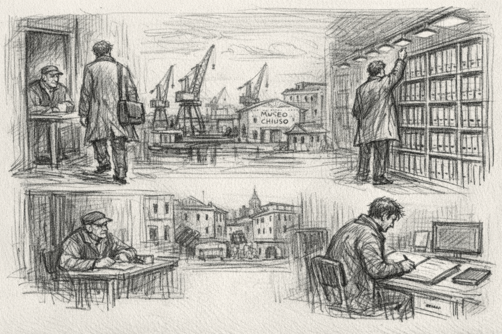 Elia Vorn arrivava in archivio sempre con un anticipo che nessuna circolare gli aveva mai imposto. Nessun dirigente glielo aveva mai fatto notare. Non era per spirito di attaccamento o per dedizione al lavoro. Era, più semplicemente, una questione di salute mentale. Entrare prima che la giornata si contaminasse di presenze, voci, domande fatte male, e urgenze proclamate tali solo perché urlate. La città a quell’ora si mostrava nel suo aspetto più genuino. Non quello turistico, ormai ridotto a due tracce mal segnalate. Non quello del museo chiuso per ristrutturazione da più di dieci anni. Neppure quello amministrativo, che si attivava dopo le nove con la puntualità di un vecchio organismo stanco. Era una città che pareva galleggiare. Tenuta a galla da un precario equilibrio tra ciò che aveva smesso di funzionare e ciò che, per mera testardaggine, continuava a funzionare. Le gru del porto immobili come a rendere omaggio a una vecchia produttività. Le facciate dei palazzi più recenti tradivano, sotto la vernice, una fiducia nel futuro ritiratasi da tempo.Il municipio non smentiva questo scenario. Un edificio funzionale, senza pretese estetiche, eretto in un’epoca in cui si riteneva che la funzionalità fosse una qualità estetica. L’archivio comunale occupava una ala del palazzo, quasi laterale, come se la memoria, anche quando istituzionale, dovesse sempre restare ai margini dell’azione.Elia entrava da un ingresso secondario. Il custode, un sopravvissuto che qualche riforma l’aveva perlomeno attraversata indenne, alzava appena gli occhi. Tra loro non c’era confidenza, ma un tacito patto di non belligeranza: sapevano entrambi che il loro mestiere consisteva fondamentalmente nel non infastidire il buon funzionamento delle cose.L’archivio, una volta aperto, non si mostrava mai uguale pur essendo sempre lo stesso. La luce, artificiale, accesa a zone, evidenziava scaffali ordinati con una bontà che non aveva nulla di maniacale. Era un ordine funzionale, nato per esperienza di errori, di ricerche andate a vuoto, di fascicoli smarriti e poi rinvenuti nei posti più impensati. Ogni scaffale era la promessa mantenuta: ciò che era stato registrato avrebbe potuto essere ritrovato.Elia iniziava la giornata accendendo le luci una dopo l’altra, senza fretta, come se l’operazione avesse una valenza rituale. Non credeva nei rituali, ma ne riconosceva la funzione. Subito dopo firmava il registro presenze. Le firme, tutte uguali, avevano qualcosa di confortante: una calligrafia anonima, sufficiente per dimostrare che qualcuno quel giorno era passato di lì. La sua scrivania era essenziale. Nessuna fotografia, nessun soprammobile. Solo gli strumenti di lavoro: un computer, un taccuino per gli appunti prettamente operativi, una biro che scriveva sempre e una che scriveva solo quando non serviva. Elia non le confondeva mai. Il lavoro d’archivio non riservava sorprese. Era, per definizione, un lavoro retrospettivo. Ci si occupava di ciò che era già accaduto, di provvedimenti già adottati, di edifici già costruiti o abbattuti, di persone che da tempo avevano smesso di contestare i verbali a loro carico. Questo rendeva il lavoro quasi terapeutico: nulla, negli archivi, chiedeva di essere risolto. Al massimo di essere capito.