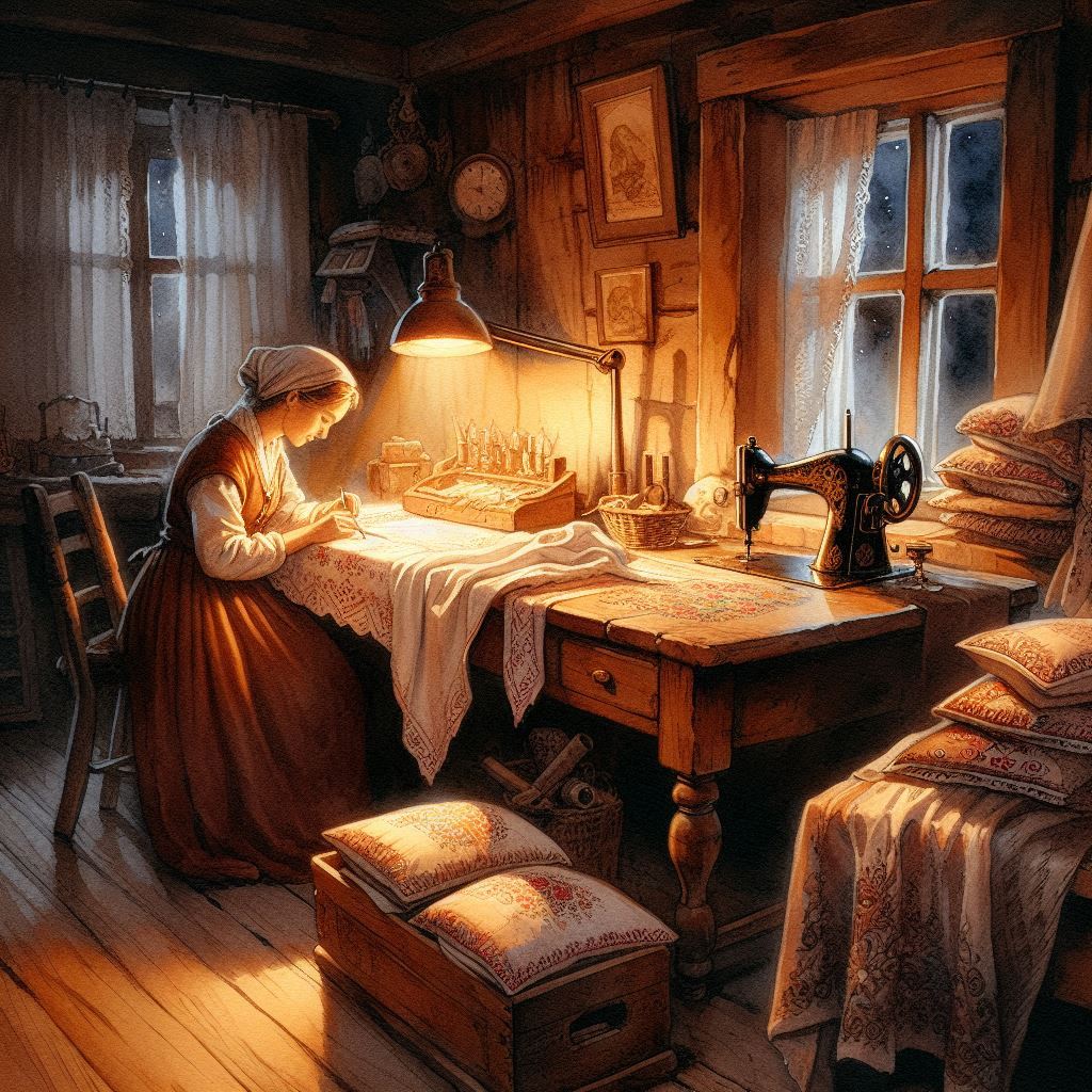Una lampada antica diffondeva una luce calda e raccolta. Le sue mani si muovevano con precisione e leggerezza, come se ogni gesto fosse misurato per non turbare il silenzio della casa e il riposo del compagno, che dormiva nella stanza accanto.